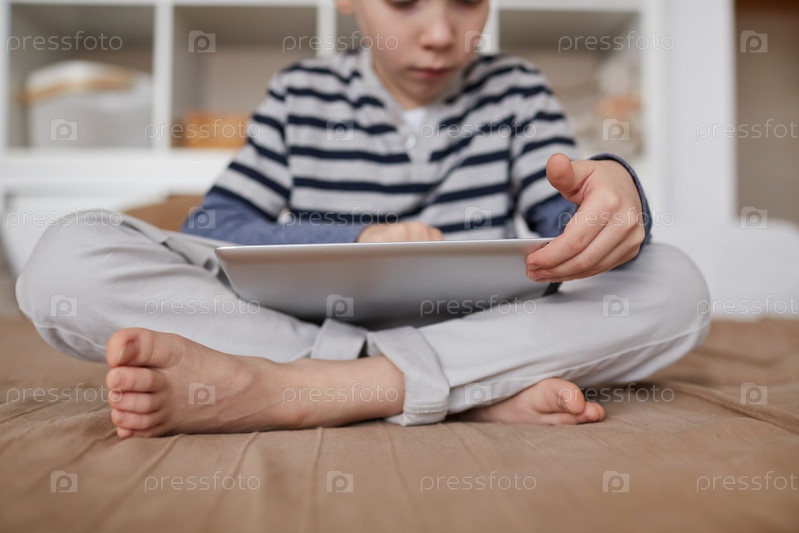 Близкий план любопытного босоного ребенка, сидящего с перекрещенными ногами на кровати и прокручивающего таблетку