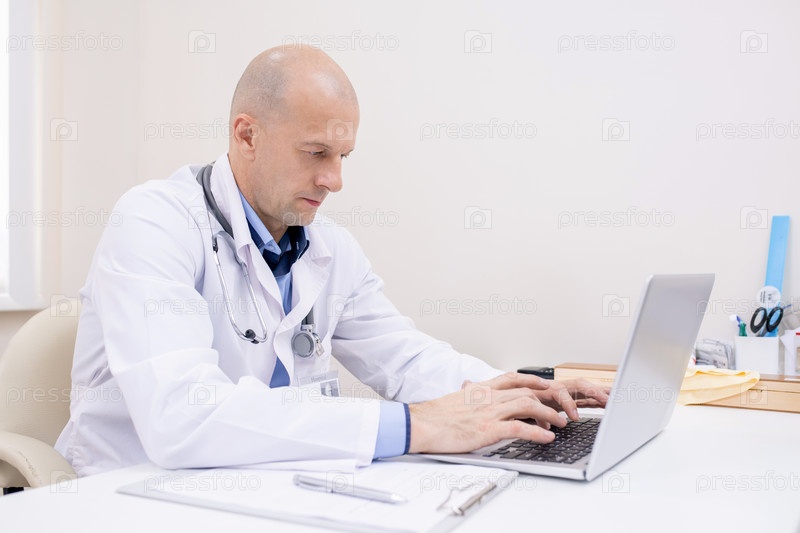 лысый мужчина-профессионал в белом халате, концентрирующийся на работе перед ноутбуком