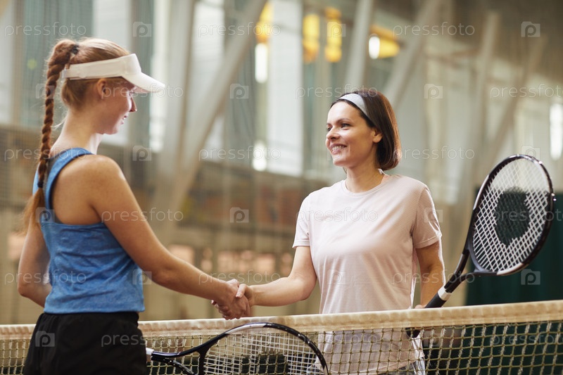 Улыбающаяся привлекательная зрелая женщина в головном повязке, держащая ракетку и рукопожатие с теннисисткой на теннисном корте