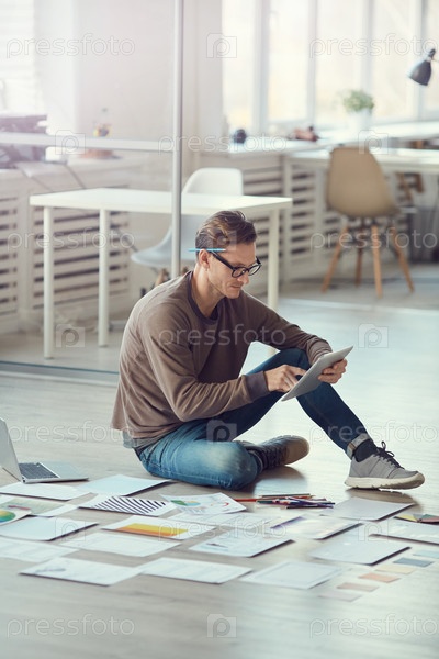 Взрослый бизнесмен сидит на полу в офисе