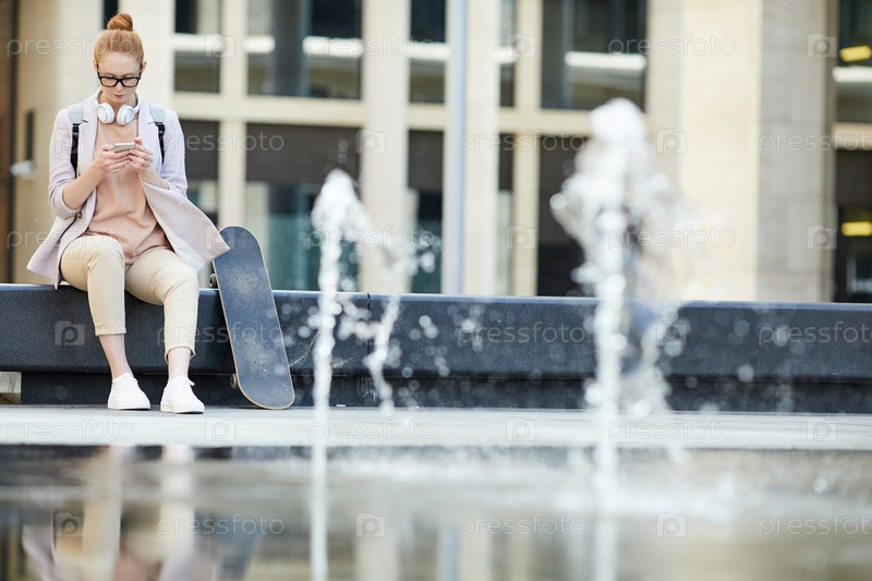 Молодая женщина использует смартфон в современном городе
