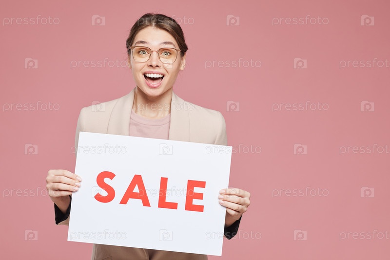 Портрет веселой возбужденной девушки в очках, стоящей на розовом фоне и держащей баннер с распродажей