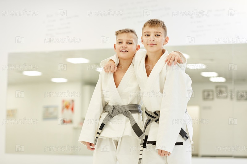 Два партнера стоят после соревнований по каратэ