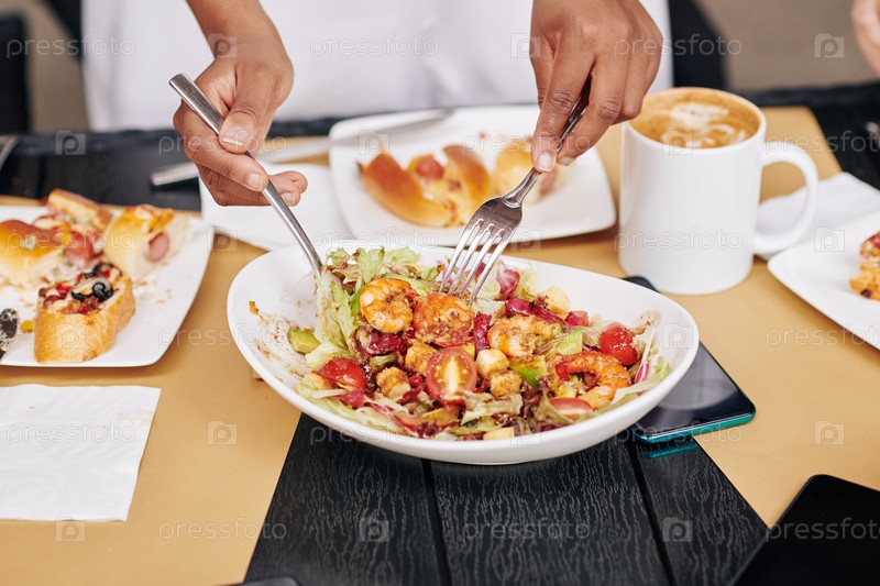 Женщина берет салат из миски