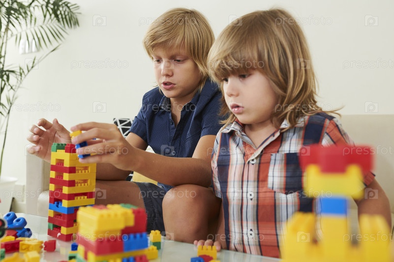 Два брата играют с пластиковыми блоками