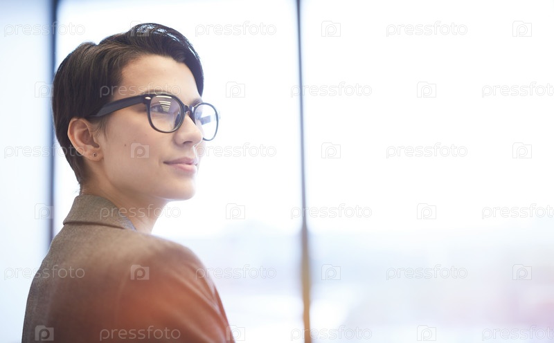 Улыбающаяся молодая бизнесвуменка стоит у окна