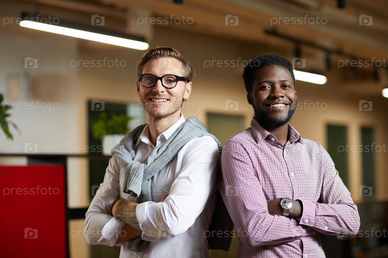 Позитивные, уверенные в себе молодые мультиэтнические стартаперы стоят спиной к спине и смотрят на камеру в офисе