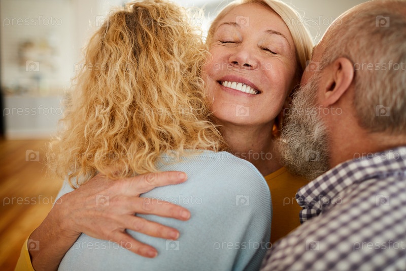 Счастливая зрелая женщина обнимает друзей