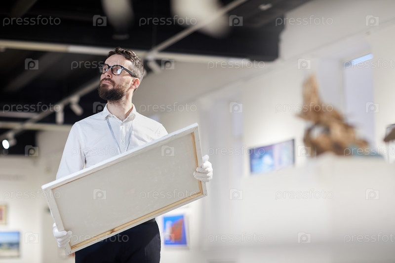 Бородатый рабочий держит картину в художественной галерее