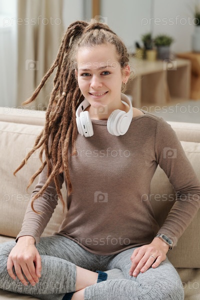 Красивая улыбающаяся девушка в спортивной одежде и наушниках сидит на диване дома