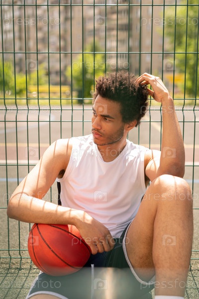 Молодой серьезный отдыхающий баскетболист с мячом, сидящим у забора игровой площадки