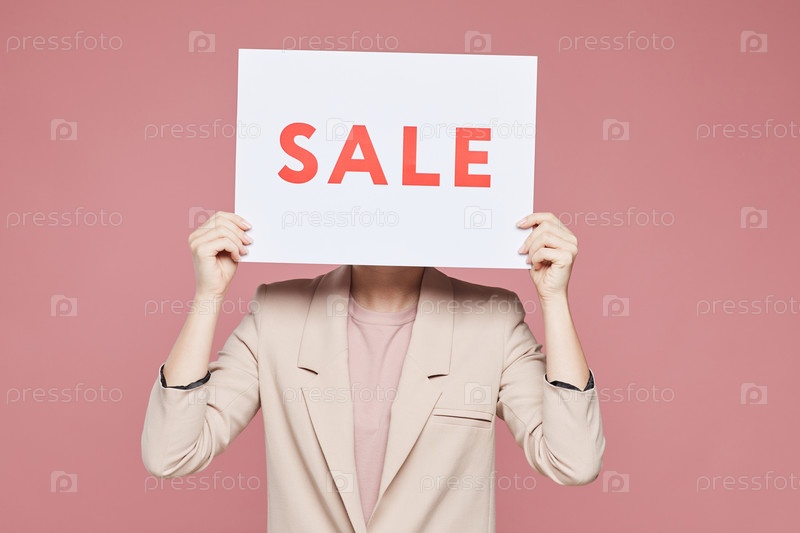 Женщина в стильной куртке стоит на розовом фоне и скрывает лицо за баннером Продажи