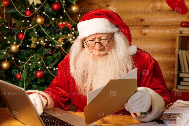 Санта-Клаус с конвертом смотрит на адрес, вводя его в ноутбук