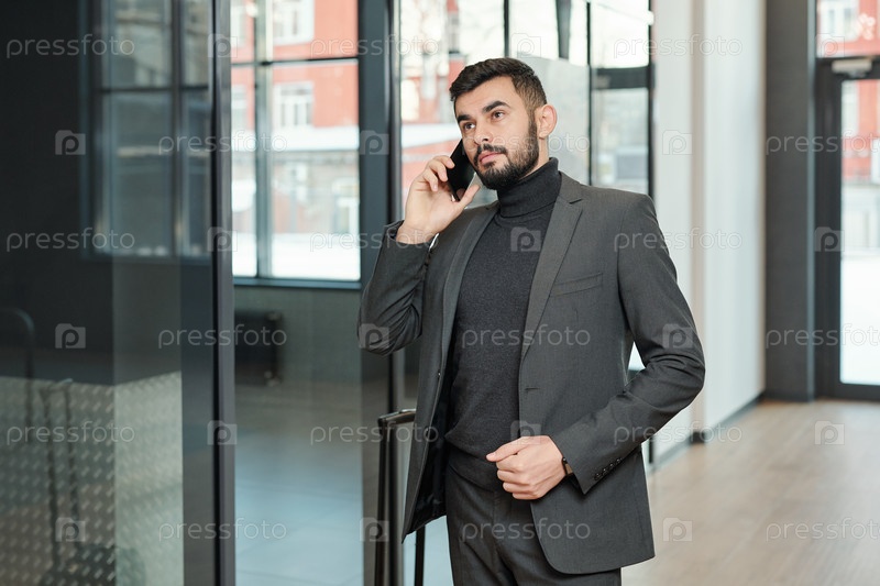 Элегантный бизнес-путешественник со смартфоном и чемоданом, звонящий в отель