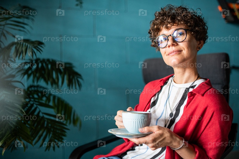Молодая безмятежная элегантная женщина с чашкой чая или кофе, расслабляющаяся в кафе