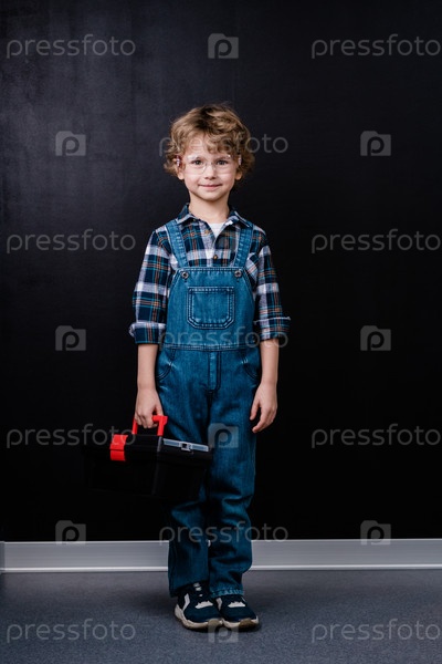Счастливый мальчик в джинсовых комбинезонах и очках, держащий ящик инструментов