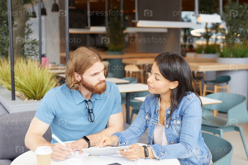 Люди, использующие планшетный компьютер в команде