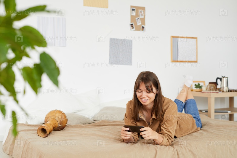 Счастливая привлекательная молодая женщина с коричневыми волосами, лежащая на кровати с джамбе и использующая смартфон во время просмотра видео в социальных сетях