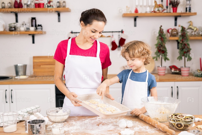 Милый кудрявый мальчик, указывающий на одно из печенья на подносе, который держала его мать за столом