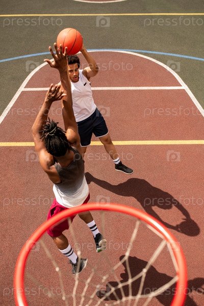Один из молодых межкультурных баскетболистов атакует мяч соперника