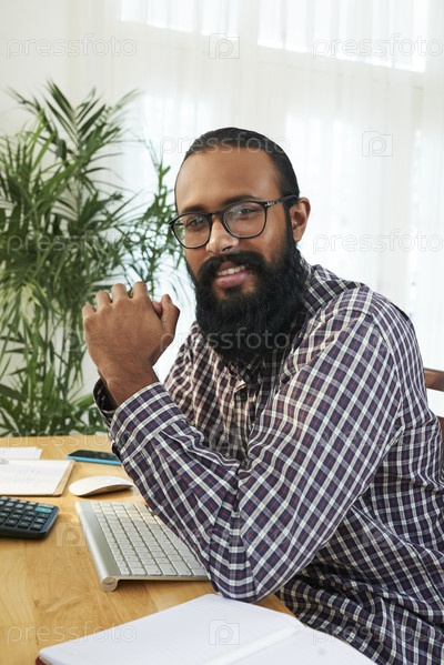 Улыбающийся бородатый бизнесмен на рабочем месте