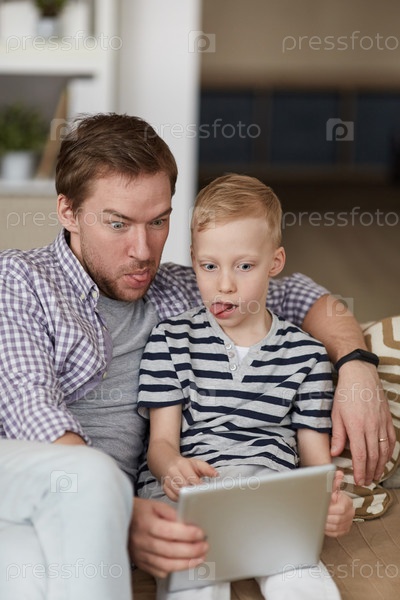 Забавный молодой отец и его милый сын, сидящие на диване и использующие цифровой планшет во время гримасирования для селфи