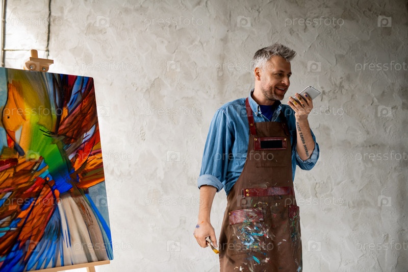 Веселый художник средних лет в рабочей одежде записывает голосовое сообщение на смартфоне