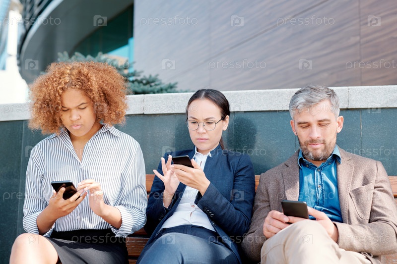 Ряд мобильных сотрудников сидит вдоль стены и прокручивает свои смартфоны