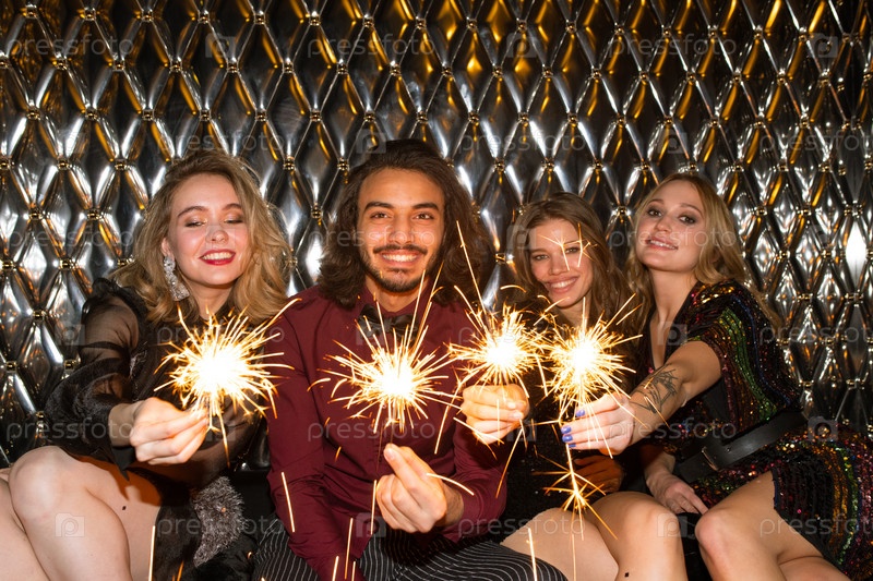 Счастливые девушки и парень со сверкающими бенгальскими огнями сидят у стены в ночном клубе