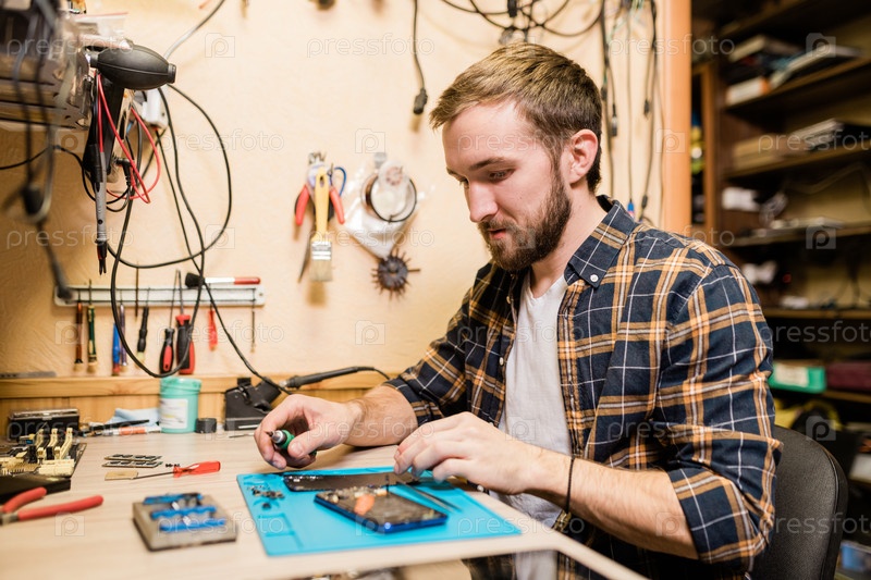 Профессиональный мастер по ремонту с отверткой восстанавливает сломанный смартфон в мастерской