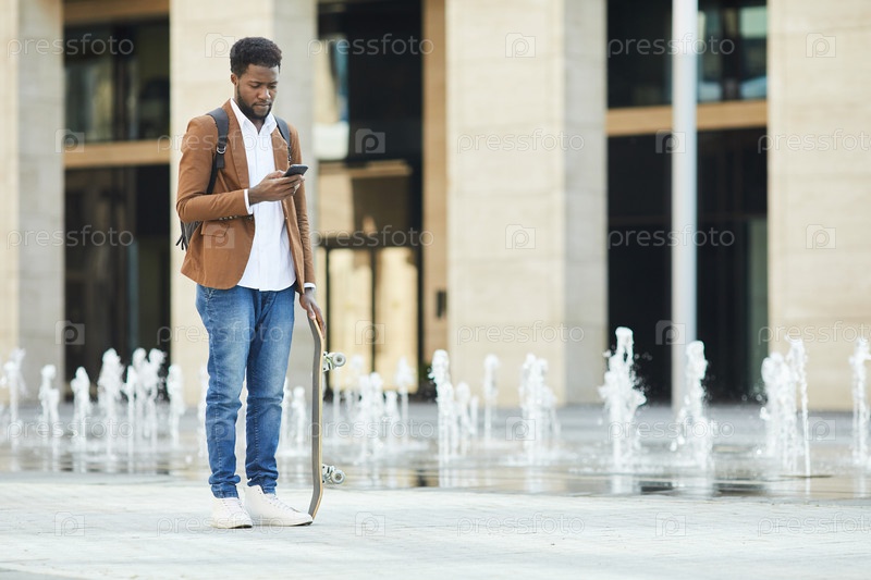 Молодой афроамериканский мужчина использует смартфон в городе