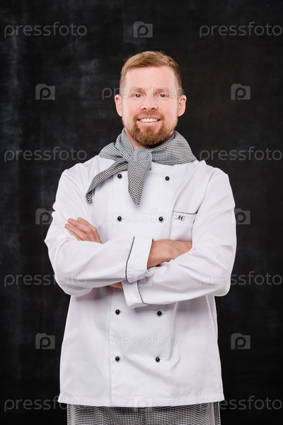 Счастливый молодой мужской шеф-повар со скрещенными руками у груди смотрит на тебя