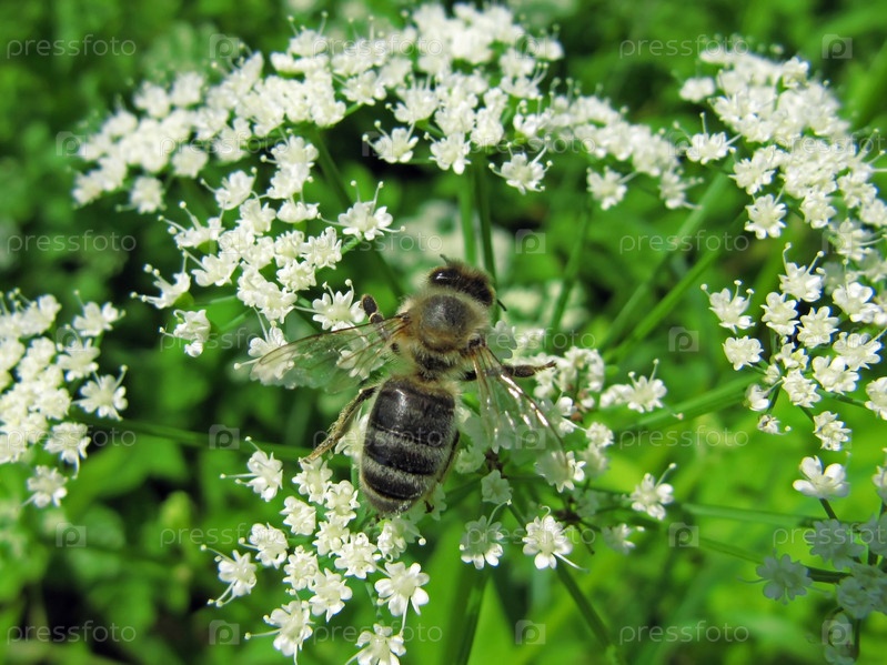 Пчела на белых цветах крупным планом