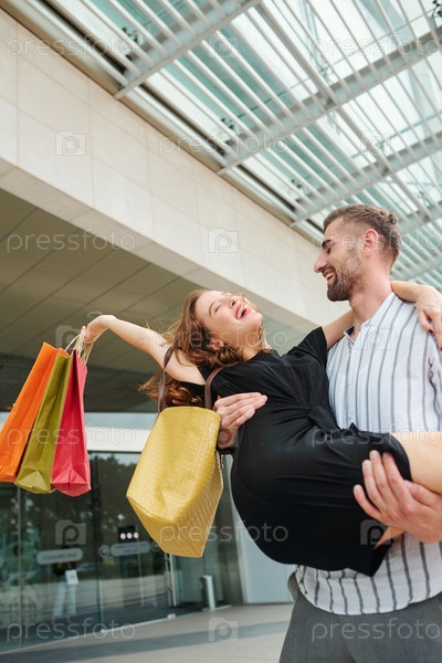 Молодой человек, несущий счастливую девушку