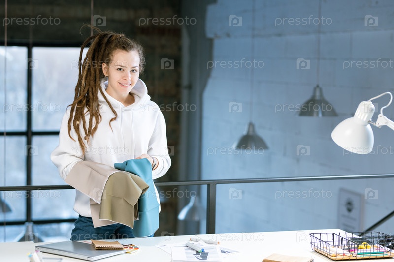 Счастливый молодой дизайнер в повседневной одежде смотрит на вас, выбирая образцы текстиля