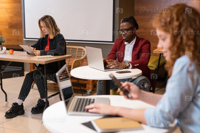 Группа студентов из разных культур, использующих мобильные гаджеты при подготовке домашних заданий