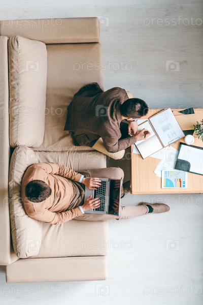 Один из двух бизнесменов делает заметки, в то время как его коллега просматривает Интернет