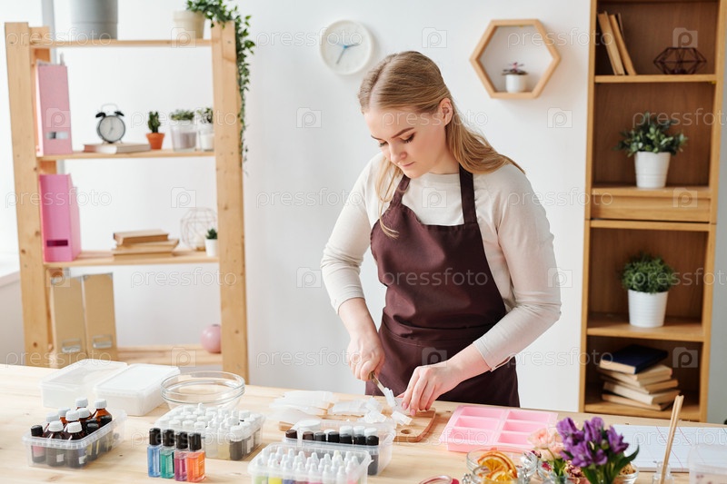 Молодая креативная блондинка в коричневом фартуке режет мыльную массу на борту