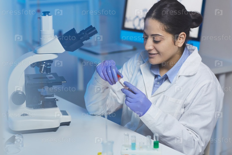 Позитивная молодая индийская медицинская исследовательница в лабораторном пальто, сидящая за столом с микроскопом и работающая с химикатами