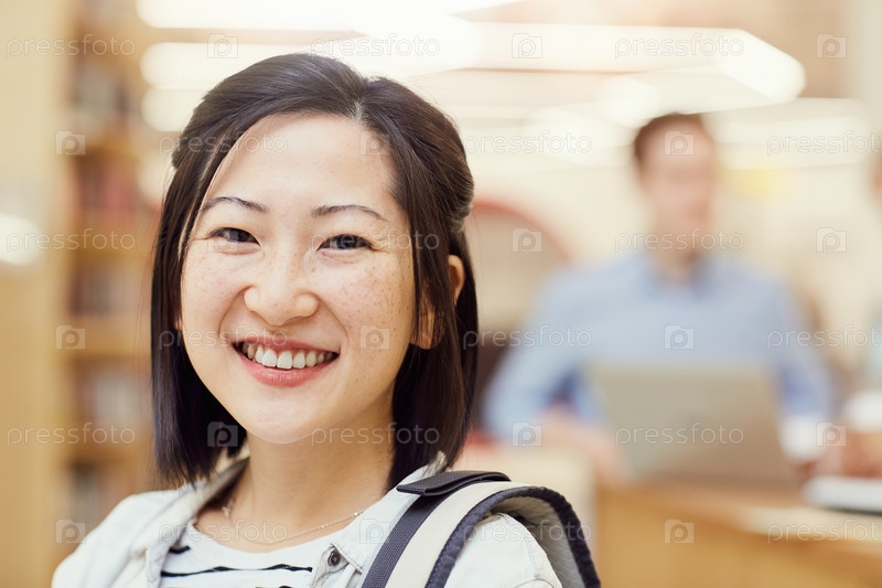 Позитивная красивая азиатская студентка с короткими черными волосами, стоящая в библиотеке и улыбающаяся на камеру