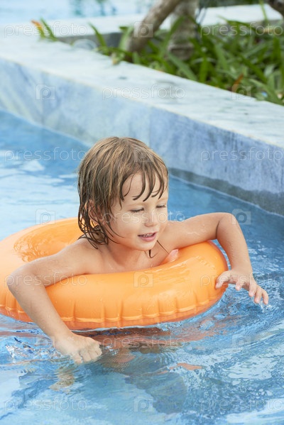 Маленький мальчик плавает с резиновым кольцом