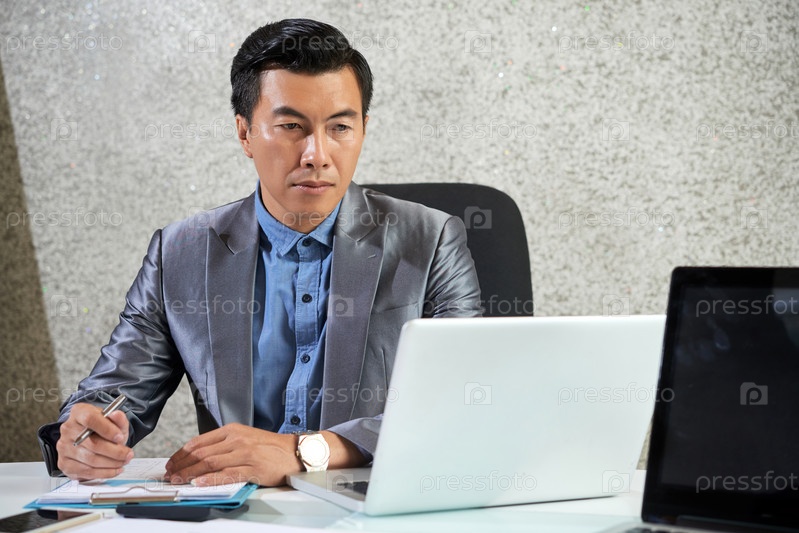 Зрелый азиатский бизнесмен, работающий на ноутбуке в офисе