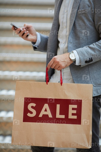 Непризнанный бизнесмен использует смартфон во время покупок