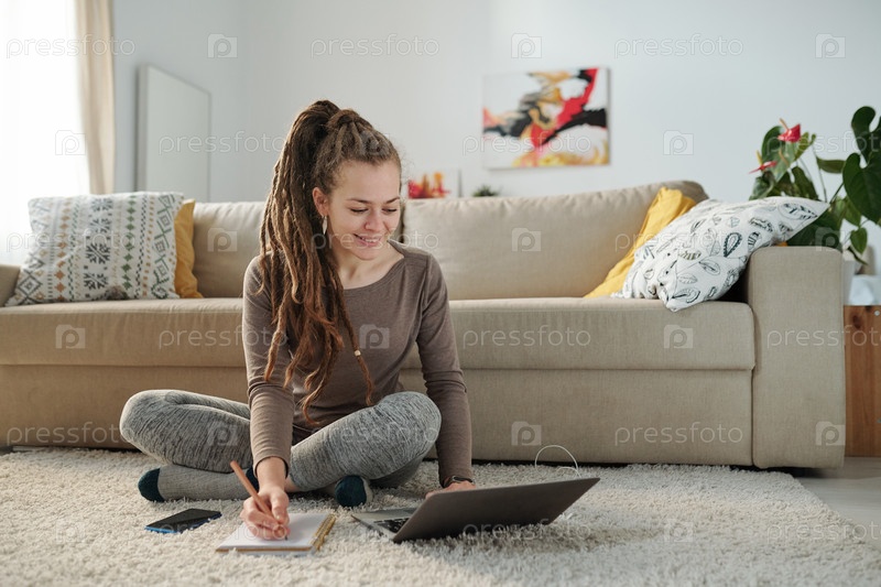 Улыбающаяся студентка с дредольками делает заметки, сидя на полу