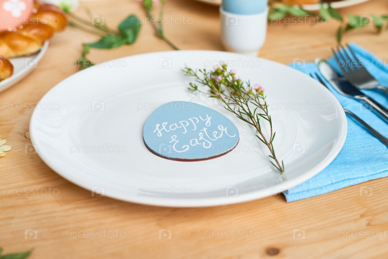 Украшенная тарелка на Пасху: крупный план пасхальной поздравительной открытки и зеленой ветвицы на белой тарелке