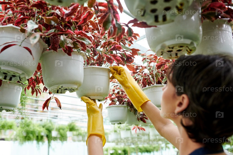 Работник питомника растений проверяет цветы