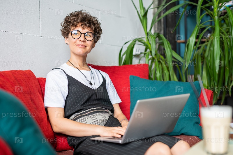 Счастливая молодая женщина в элегантной повседневной одежде сидит на диване с ноутбуком перед собой