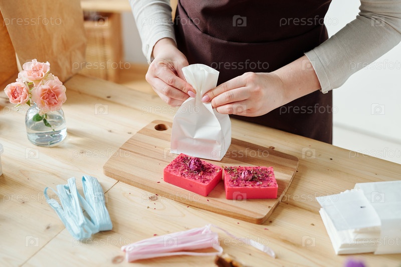 Руки девушки, упаковывающей розовый ручной сапун в бумажный пакет на деревянной доске