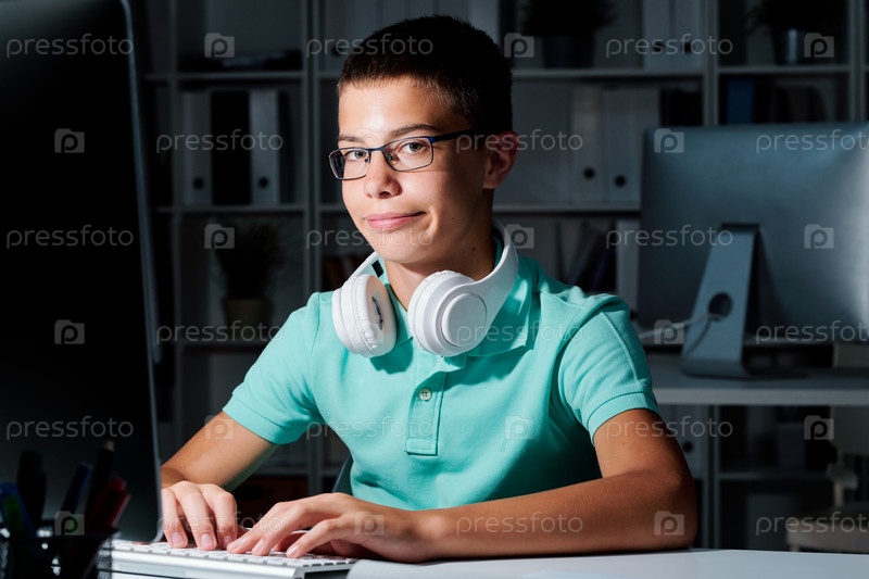 Молодой серьезный школьник в очках смотрит на тебя во время сетевого общения поздно