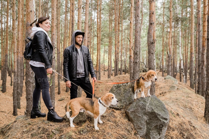 Счастливая молодая пара в повседневной одежде, держащая на поводке двух милых щенков-биглов